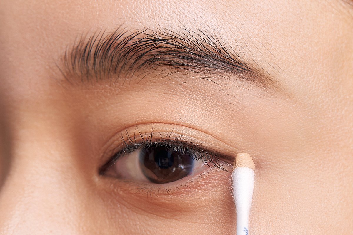 綿棒の先にリキッドコンシーラーを少量含ませ、ラインを落としたい部分を優しく拭う。