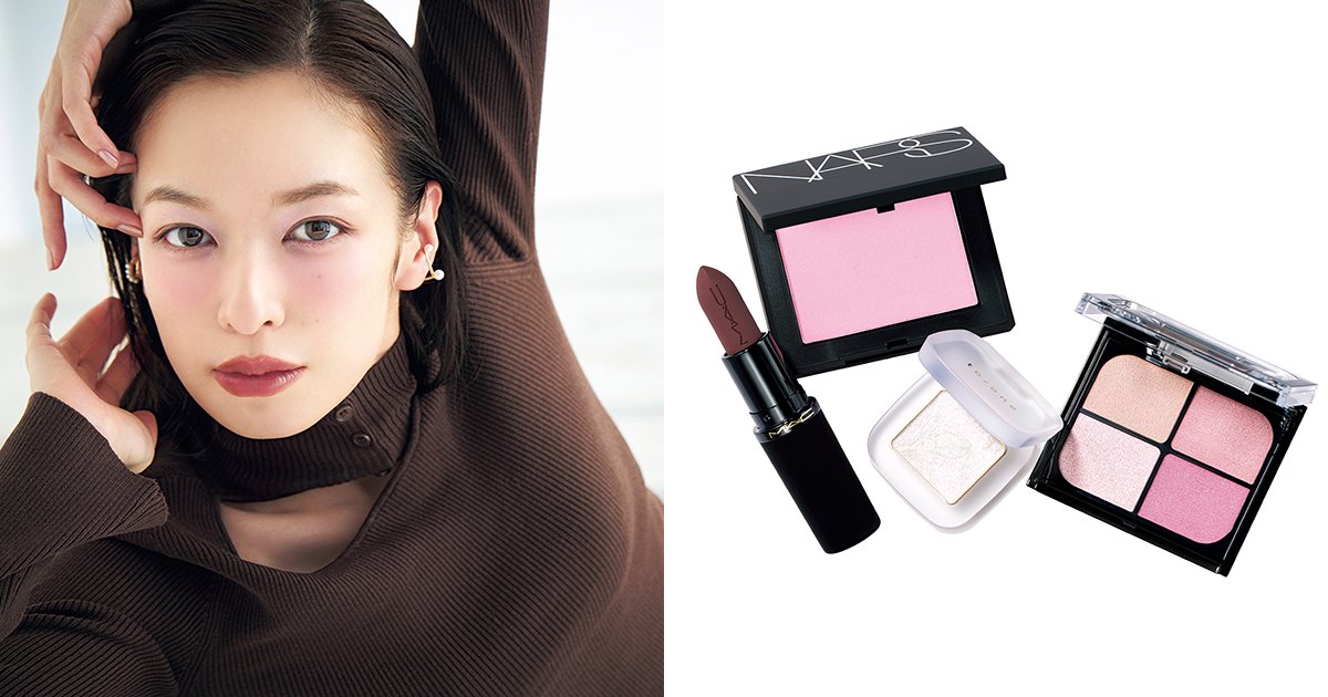 “透明感が高まる青みピンクを目元や頬に宿しつつ、眉は明るく、まつげにはマスカラも塗らず抜け感を出して繊細に仕上げたら、口元には大胆な程こっくりとしたダークチョコカラーのリップをまとわせて。青みトーンによって引き出された肌の透明感が、赤み控えめのダークカラーとの対比によってさらに際立ち好印象で品のある、しゃれた大人の雰囲気を醸し出します”