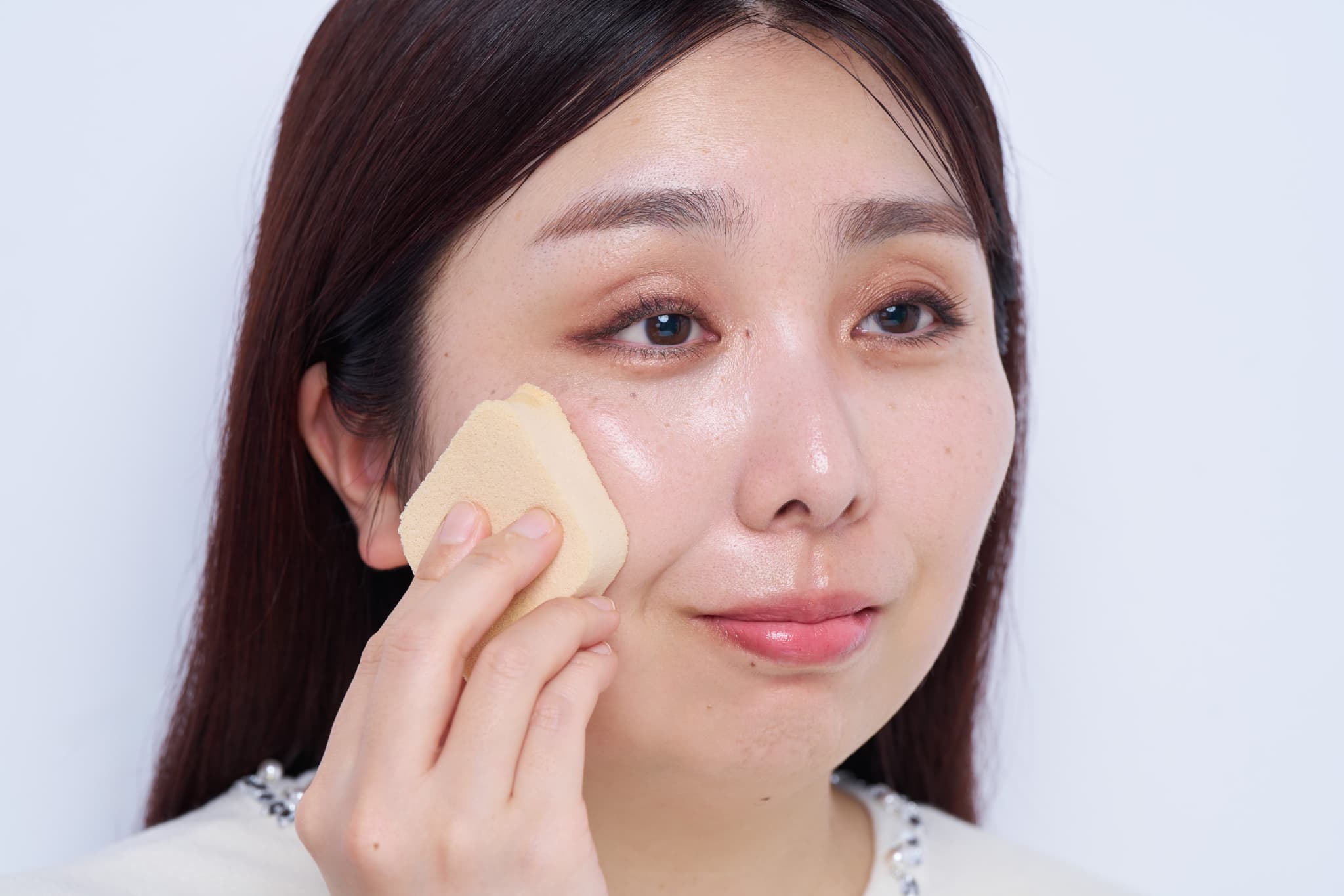 下地を塗り終えたら、仕上げにスポンジで軽くタッピング。余分な下地を取りながら、肌と一体化させることで密着力が格段にアップします。このひと手間を加えるだけで、ヨレにくく、時間が経ってもシミや肝斑が浮き出にくいベースに。次に重ねるコンシーラーも定着しやすくなります。