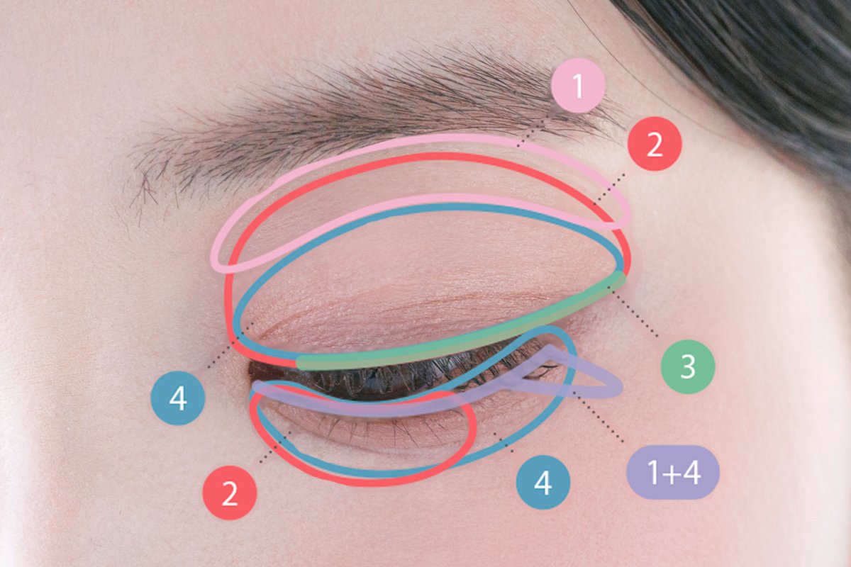 Aの②を上まぶた全体に広げ、①を上まぶたキワから2/3の範囲に、さらに④を1/3の範囲に重ねる。③で上まぶたキワを埋める、④を涙袋全体に広げ、②を涙袋の目頭から黒目外側までのせてぷっくり感を演出。④で下まぶたの3角ゾーンを埋める。