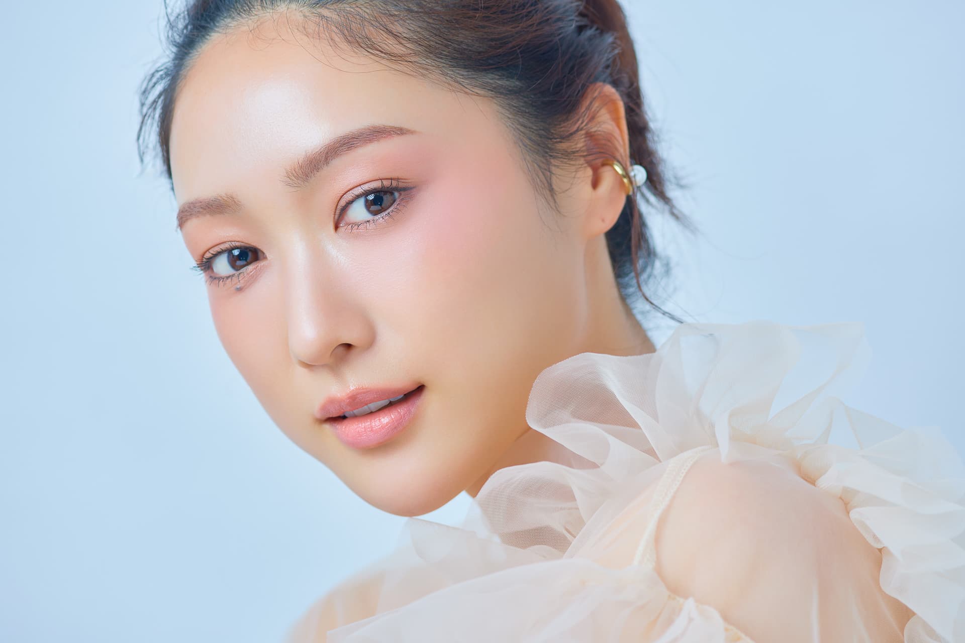 「年齢とともに顔の余白が気になったり、間延びしたような印象を感じてしまうのは、メイクを狭い範囲で完結させてしまっているからかもしれません。その余白を埋めるために、アイシャドウは目元だけ、チークは頬だけと分けるのではなく、それらをひとつのメイクとして捉えてみてください。目元から頬までを延長線のように、ふわふわと広めに色を繋げるだけでいいんです。