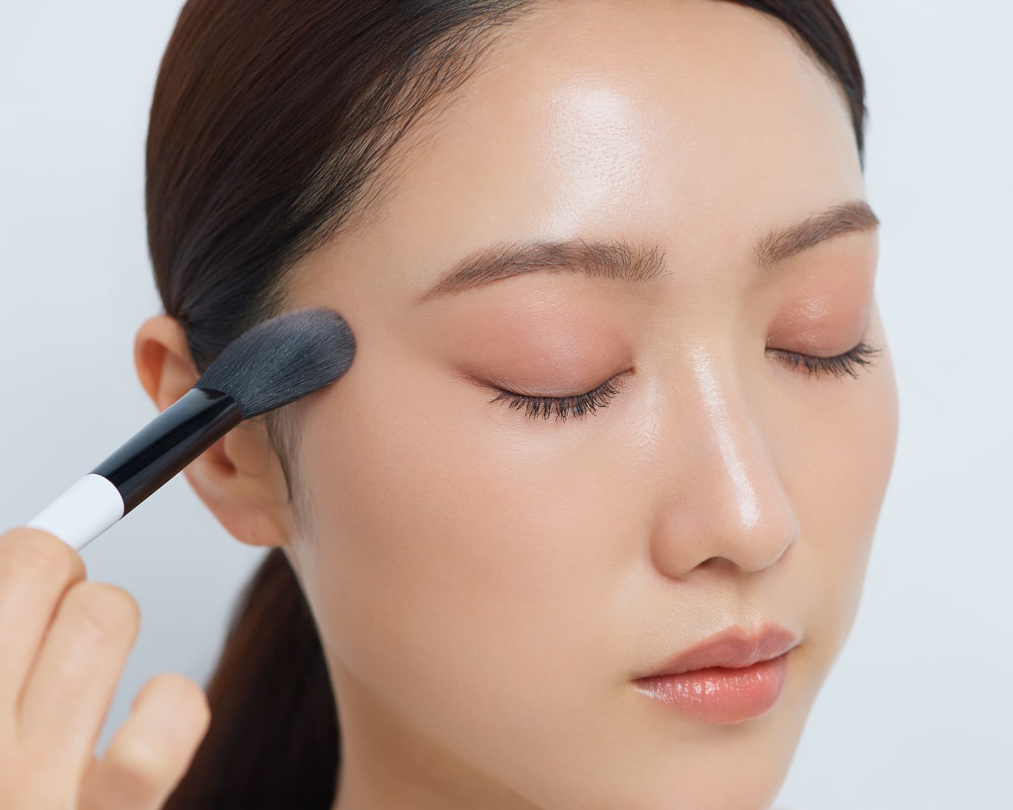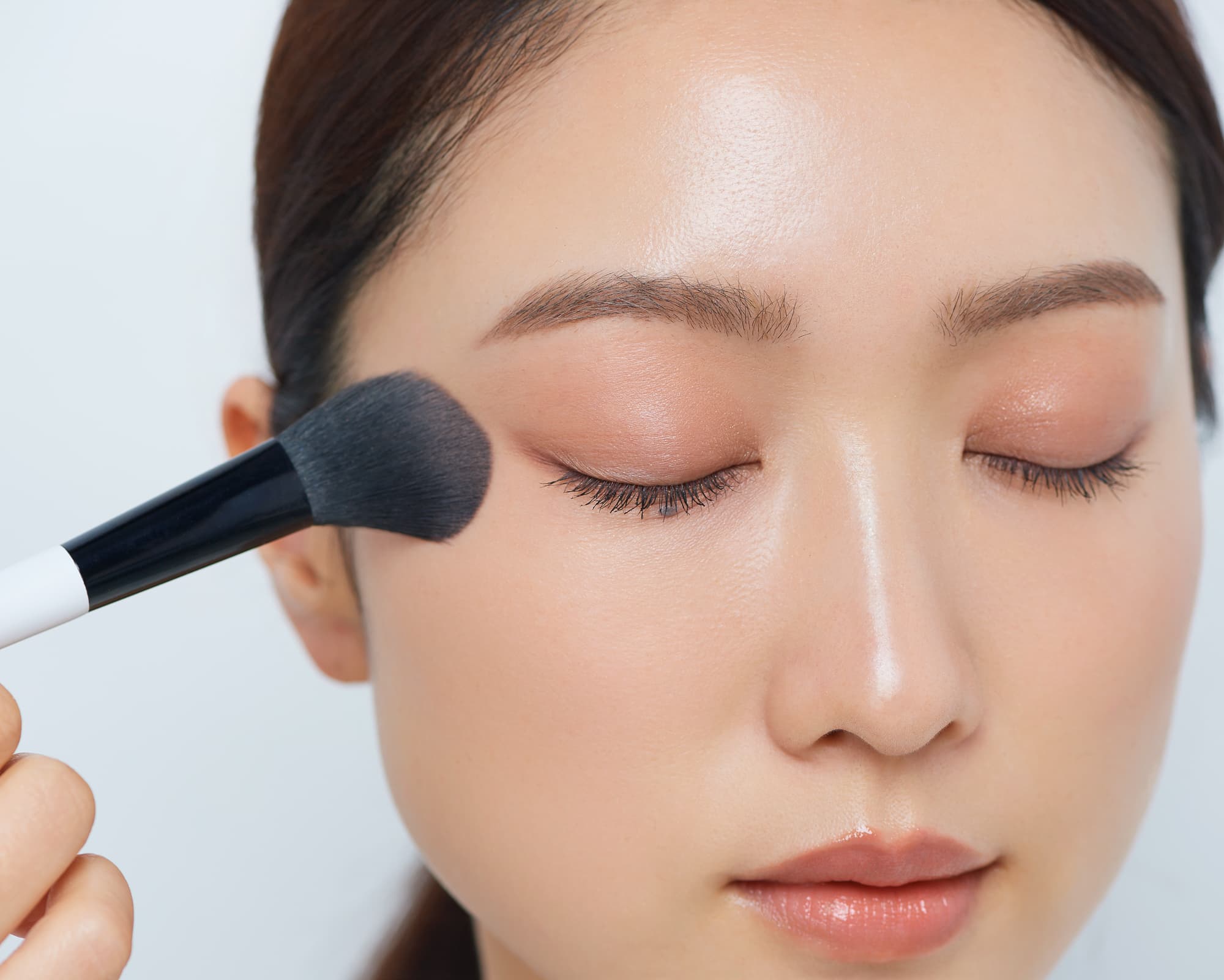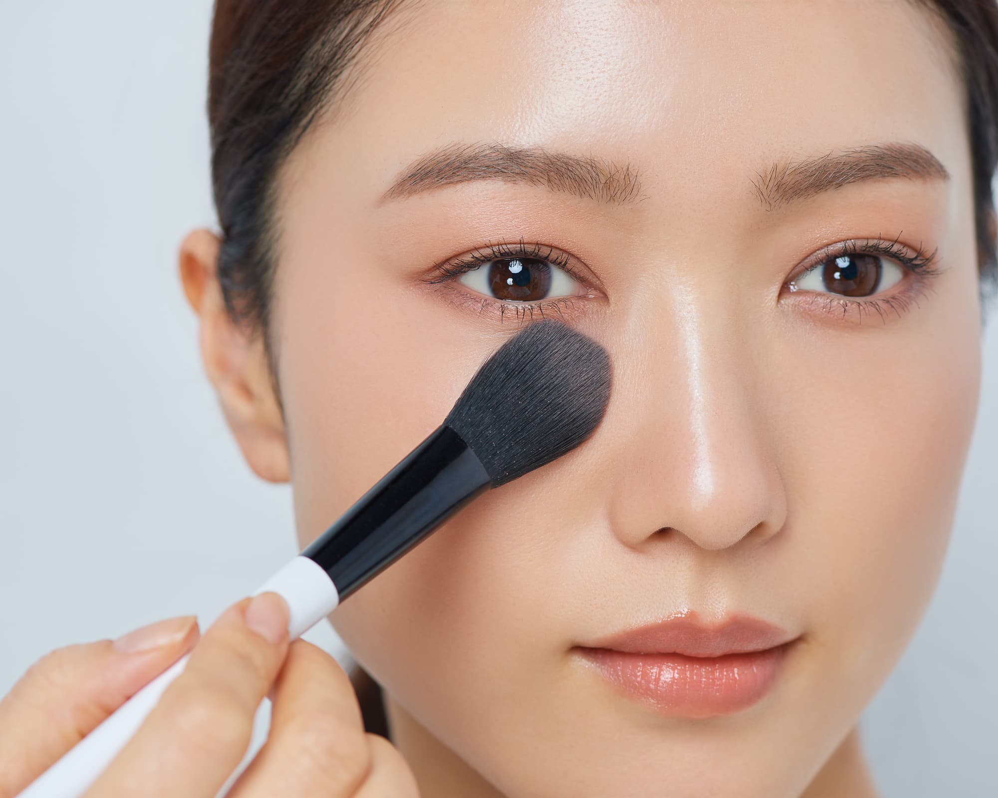 そのままのブラシで目の下も目頭から目尻にかけて目を囲むようにサッと色をのせて。目元と頬が地続きになることで、顔がキュッと引き上がって見えます。