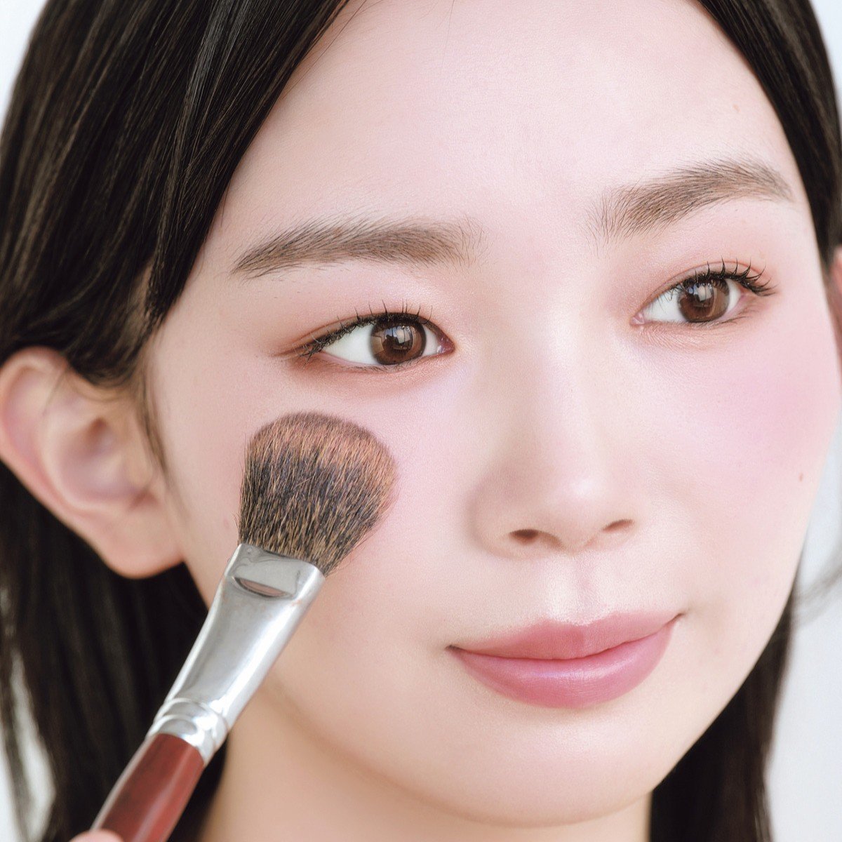 (3)頰の上の方にチークをのせてふんわり紅潮させる