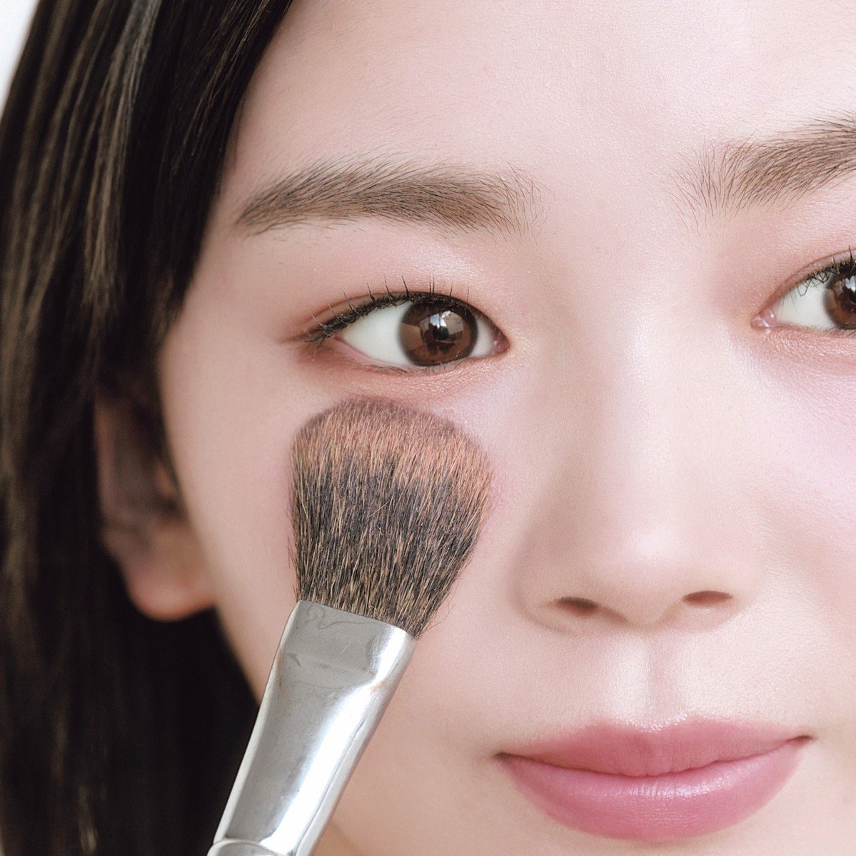 手の甲に出したBを再度ブラシでとり、黒目の下にふわふわっと重ねづけ。涙袋にかかるくらい高い位置にのせて、うぶな血色感を演出する。