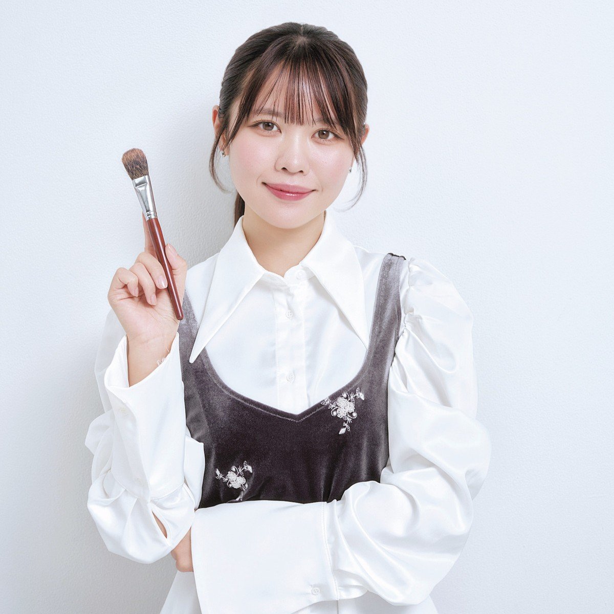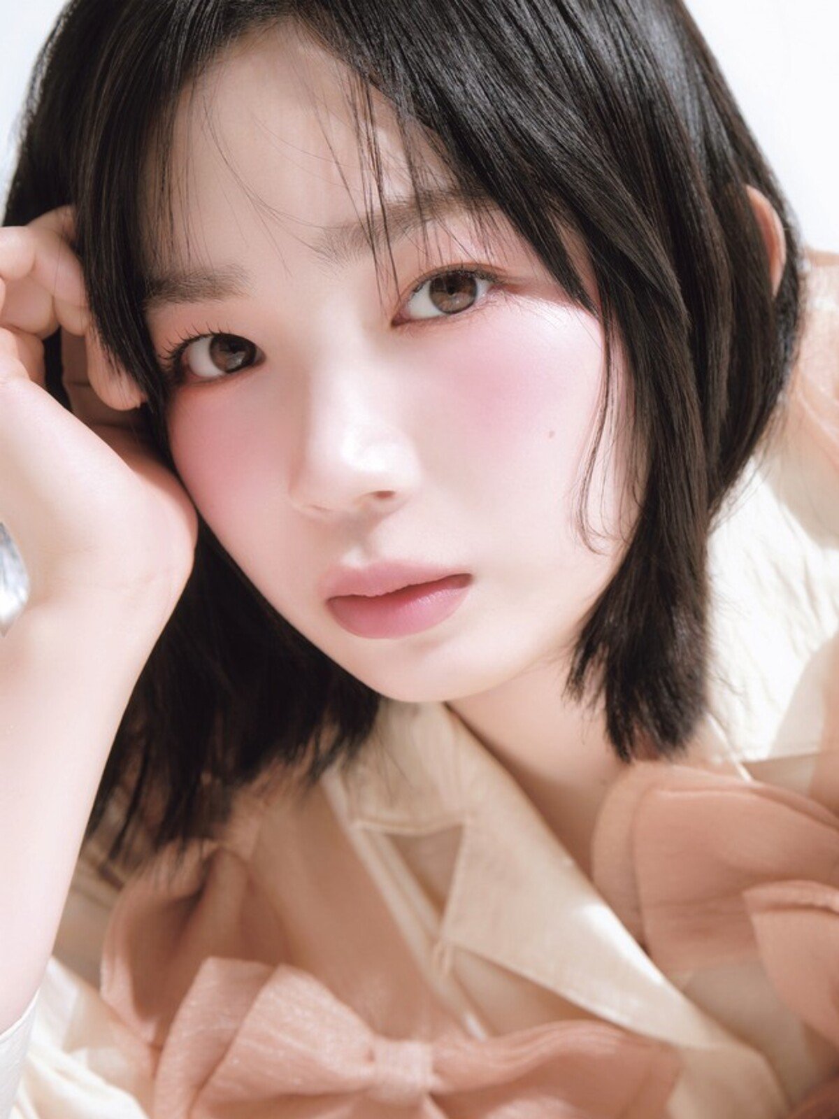 美肌感やピュアさを出すには、毛穴を目立たせないことが大前提。まずはシアーマットな質感のブラー効果のあるハイライターでくすみをはらいます。ピンクみのあるカラーなら血色感も仕込めて◎。土台が整ったところに、柔肌に見せるセミツヤ系の血色チークをレイヤード。リアルな血色感がにじみ「素肌そのものがキレイ」な仕上がりに