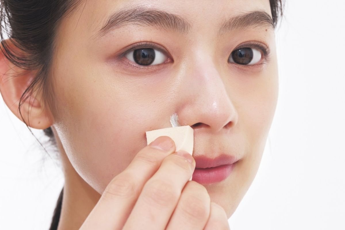 (1)グリーンのコンシーラーを小鼻の横にのせスポンジでぼかす。