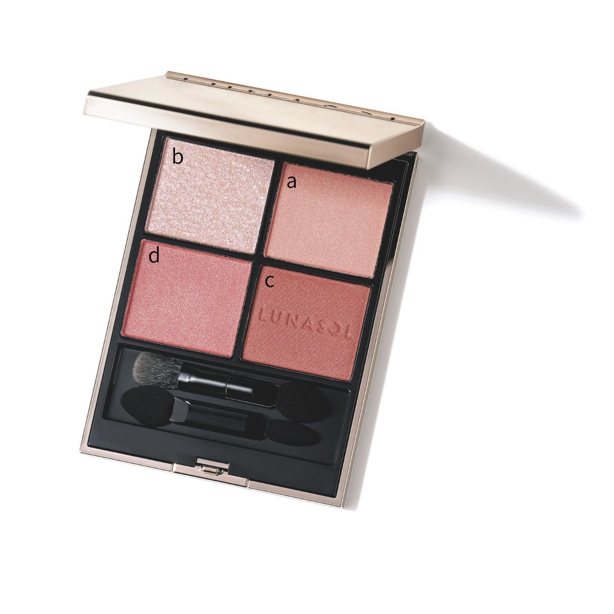 Eのa をアイホール全体に、上まぶた1/2くらいにc を入れ、陰影をつける。下まぶたにd を入れる。b を目頭の内側のくぼみから下まぶたのハイライトゾーンに。鼻根の横にも間をあけて入れる。Aで上まぶたの目尻からやや長めにアイラインを引き、優しく引き締める。