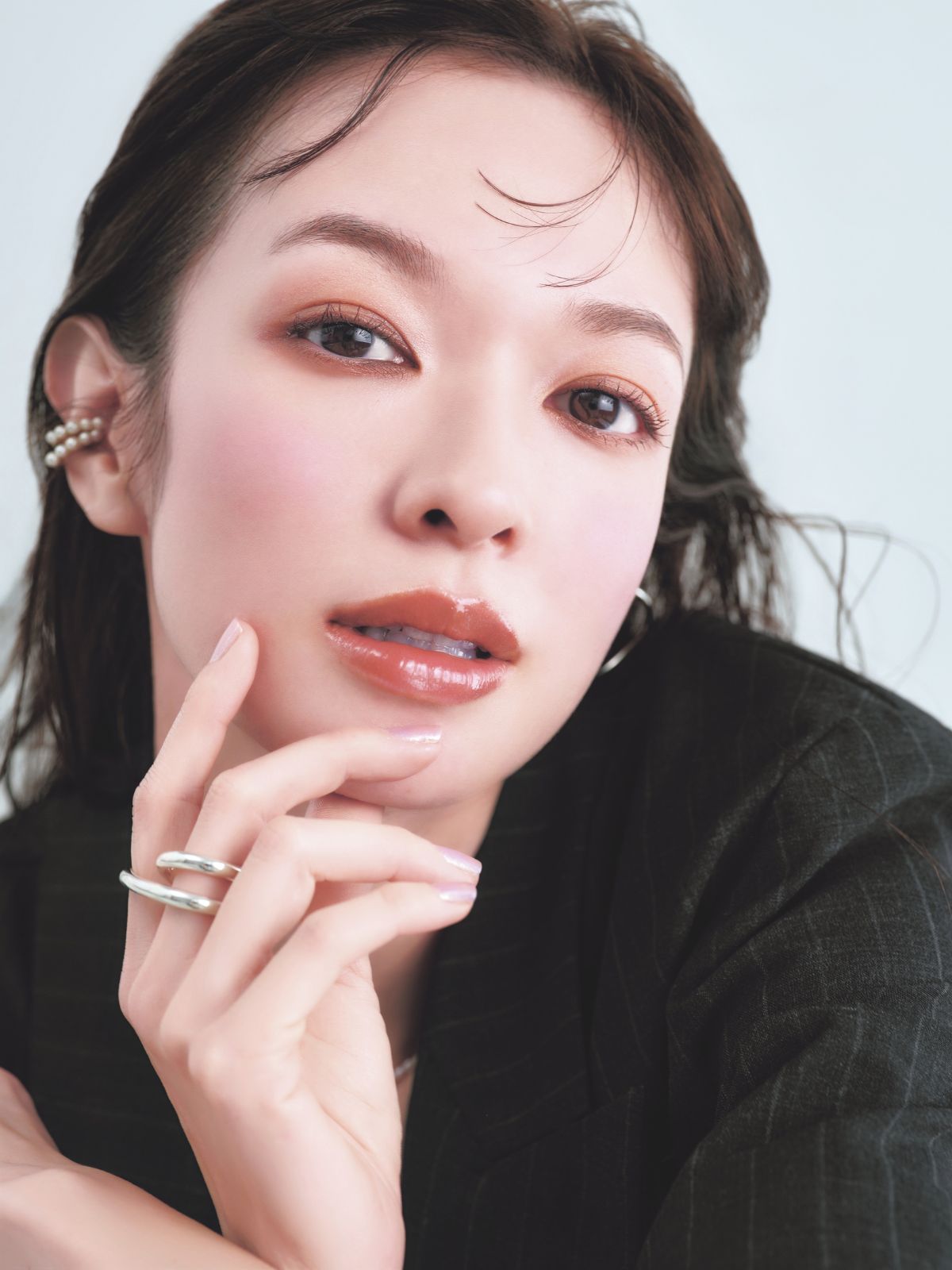 「カッコいい美しさを醸し出す彩度低めの低温ブラウンのツヤリップが主役のメイク。心が整っていて、意志が強いけれど優しくて柔らかい、まさに森 絵梨佳さんの気高い雰囲気にインスピレーションを感じて色づけたメイクです。クールトーンのブラウンは、透け感とツヤ感のあるアイテムで生命感・みずみずしさを出すと怖くなりません。トレンドのラベンダーチークで低温の中の抜け感を出してしゃれ感アップ。」――by Kanako