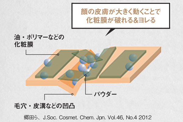 塗りたては肌の上に均一にのっていた化粧膜が、皮膚の伸縮が繰り返されることによって破れ・ヨレることで不均一化。パウダーが溝に溜まって化粧くずれの原因に。