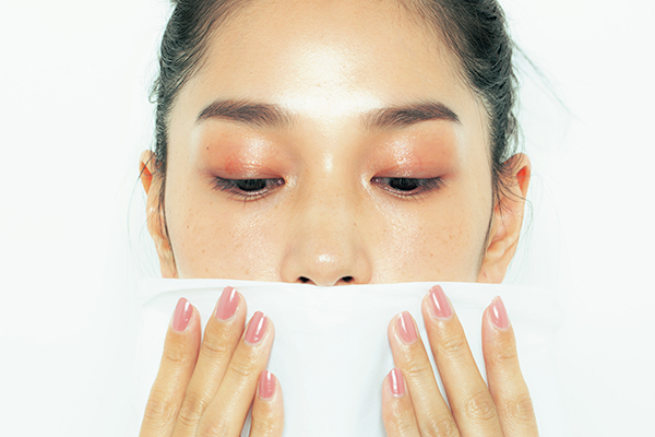 まずは皮脂や、浮いてしまったファンデをオフ。ティッシュor脂取り紙で肌全体を軽く押さえる。