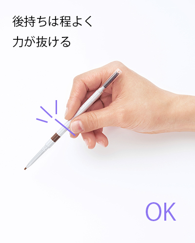 手の甲などでペンシルの先を細く尖らせておくとより繊細に描ける。その後、スクリューブラシの先端を当て、描いた線をつぶさないように細かくぼかす。