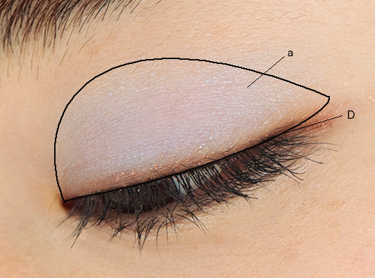 キッカ フローレスグロウ リッドテクスチャー アイシャドウの薄いブルー(a)をアイホールより広めにブラシでふんわりのせ、コスメデコルテ アイグロウ ジェム(D)を細ブラシにとってキワラインを。薄ブルーをぼんやり見せない自然なパッチリ効果が。