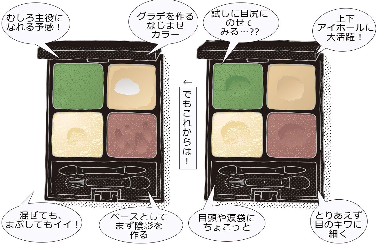「確かに今のアイシャドウは暗い色にも透明感があるので、その塗り方でも今っぽく仕上がりますが、もっと自由に、しかもパレットに入っている色を均等にフル活用できるグラデーションの作り方があるんです。ポイントはレイヤードではなくあくまでグラデーション! どんどん色を重ねて色を濁らせるのではなく色と色の境目を自然になじませるのがコツなんです」(長井さん)