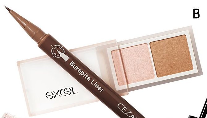Bの左の薄いピンクベージュをアイホールと下まぶた全体になじませたら、右のブラウンベージュを上まぶたのキワから重ねてシンプルなグラデーションに。