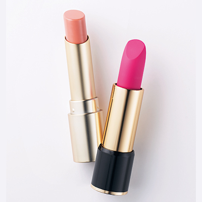 朝に使ったベージュのリップを上唇のみややオーバー気味に唇全体へじか塗りした後、マットな質感のビビッドピンクのリップ(右/ランコム ラプソリュ ルージュ DM313 ¥4,000)を唇の中央だけに重ねる。指で軽くたたき込んで、色の境目をぼかして。色と質感のコントラストにより、自然な立体感のある唇に。