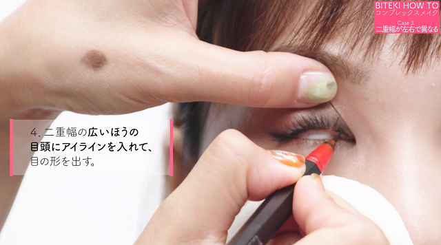(4)二重幅の広いほうの目頭にアイラインを入れて、目の形を出す。