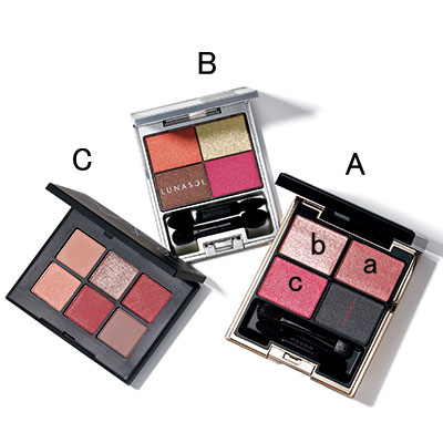 A-a を指でアイホールにのせたら、下まぶたにも軽くのばして囲み目に。A-c のみ細チップを使って目のキワにライン風に入れ、A-b はハイライトとして目頭に。