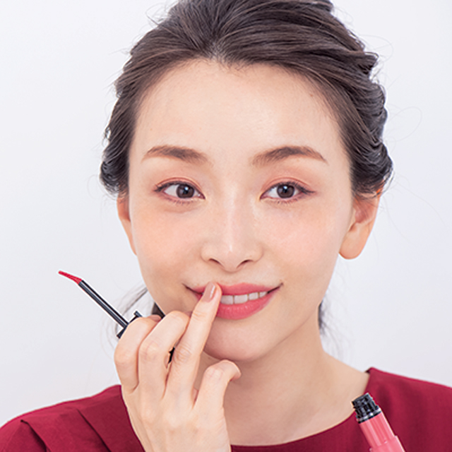 顔がおしゃれになる透け感マットリップ。唇のエッジを指でぼかすと、よりこなれた印象に。