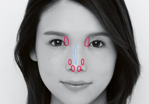 - 鼻筋と鼻先の間はハイライトを入れず“つん!”と見せ。