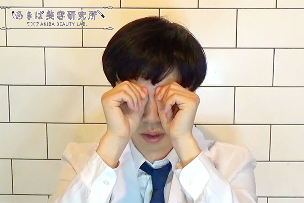 (2)まぶた上下を指2本ずつで目頭からこめかみへ軽く3回引き上げ、最後にこめかみを押す。
