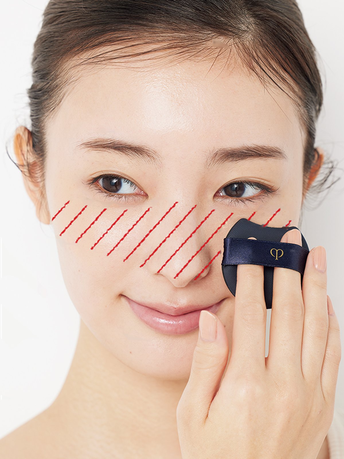 クッションファンデーションを付属パフにとり、手の甲で軽くたたき込みなじませた後、シミや毛穴が多い頬から塗り始める。優しく小刻みにたたき込みながら両頬へ均等に塗ったら、鼻筋へ。その後、つけ足さずに目元にも広げていく。