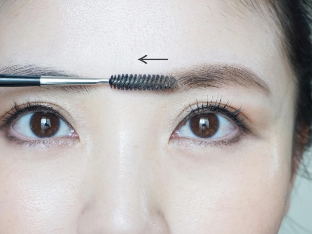 毛並みに倣って、スクリューブラシで眉頭から中間、眉尻へと眉全体をとかす。描く前に、自分の眉毛がどう流れているのか見極めておくと無駄に描きすぎることなく、描いた感たっぷりの眉とも無縁。
