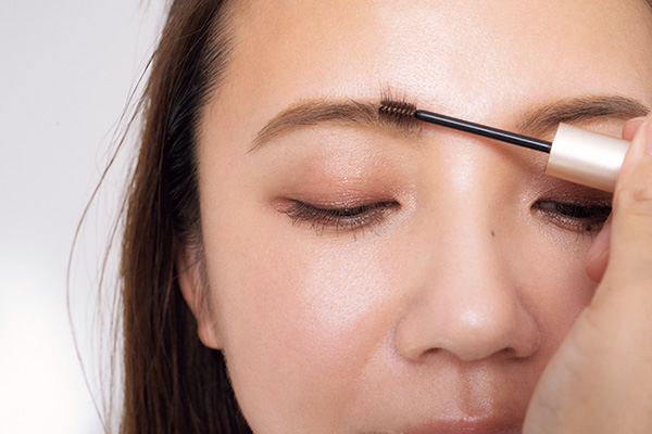 仕上げは、クリアな眉マスカラ。軽くティッシュオフして余分な量をオフ&ブラシに均一になじませたら、眉の中間、眉尻、眉頭の順に塗る。毛流れを整える感覚で、眉の中間は横に、眉尻は斜め下に、眉頭は真上にブラシを滑らせるのがポイントに。