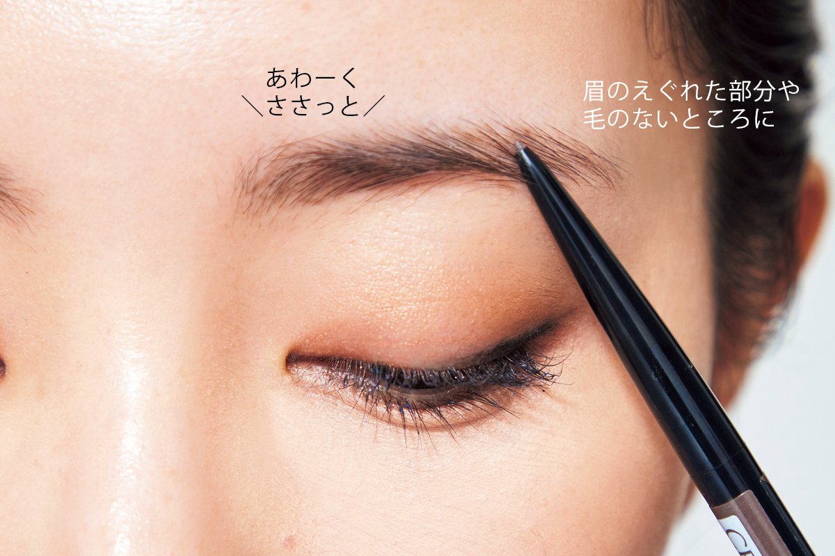 ここまででだいたいの眉の形は描けているはずだけれど、上辺や下辺に少しガタつきがある場合、そこのみペンシルで描き足す。短い毛を1本1本描くつもりで。