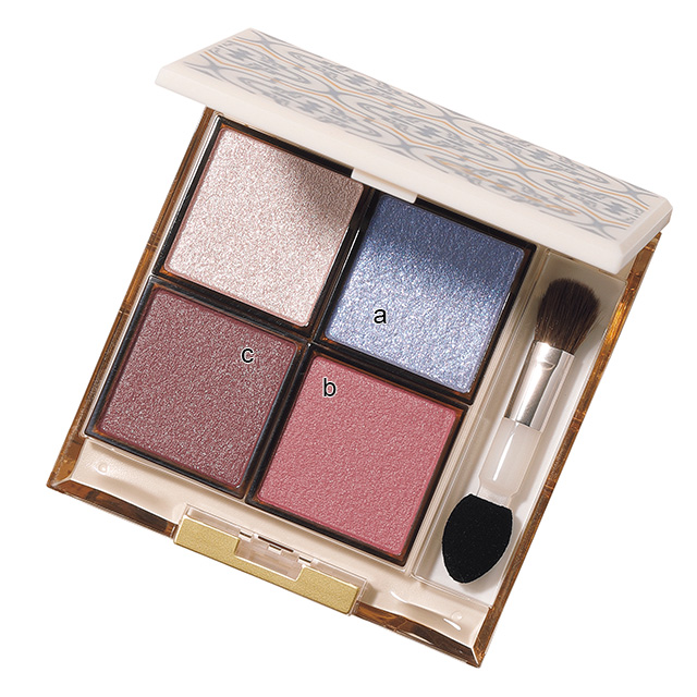 アイホールにb、二重幅よりもやや広めにcを重ねて温かみのあるグラデーションを作ったら、aを中央部にふわっと重ねてアクセントに。下まぶた目尻側にcを引いてワイドな目力をプラス。