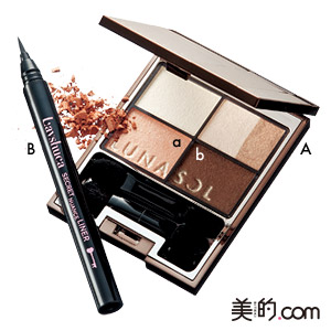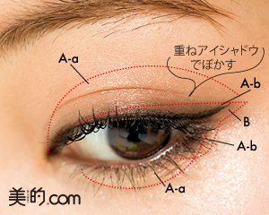 アイホール全体にA-aを入れてまぶたをトーンUP。上まぶたの際全体にBでラインを入れ、目尻は2~3mm出してはね上げる。ラインの上にA-bを重ねて、ラインの強さをほんのり中和し、自然に見せる。下まぶたはA-aを全体に入れ、目尻側1/3にA-bをたれ目風に入れる。