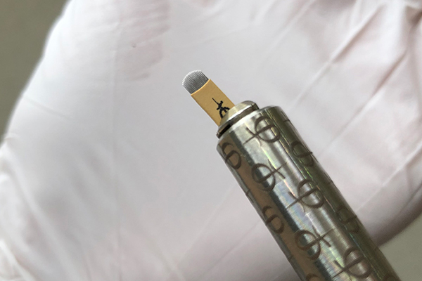 次はいよいよメインである「彫り」のステップ。いよいよ眉毛を染料で描いていきます。色選びも大事な作業。自眉よりワントーンだけ明るい色がいいかも……と、8色のうち、私に合うものを選んでもらいます。このあたりは自分の好みを伝えてあとはプロにお任せしました。色が決まったら、針が一列に数本並んでいる道具を使って、引っ掻くように眉毛の線を描いていきます。「カリカリカリ、カッカッカッカッカッ」と“音にならない音”が出ている感じ。麻酔をしているので痛みはないのですが、ちょっと不思議な感じ。ひと通り描き終わったら、染料がなじむまでしばらく放置します。
