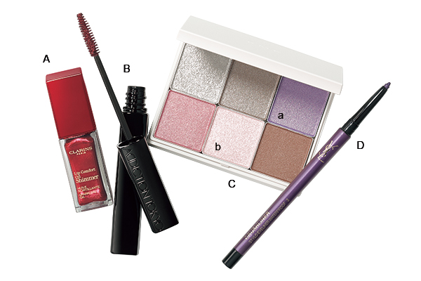 アイホールにC-bをふわっとのせ、二重幅と下まぶたは目頭を中心にC-aを入れる。アイライナーDを黒目の下の粘膜に引き、マスカラBは下まつげにオン。下まぶたを強調して甘さを出して。リップAは3回くらいたっぷり塗り、唇を合わせてなじませて。
