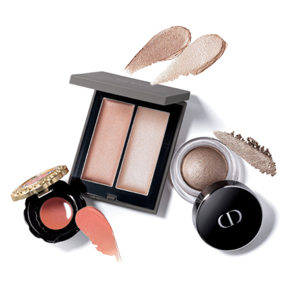ベージュブラウンの単色シャドウをアイホールになじませ、右側のベージュハイライトは目の下、左側のコーラルハイライトはチーク代わりに頬骨に沿って軽くたたき込んで。