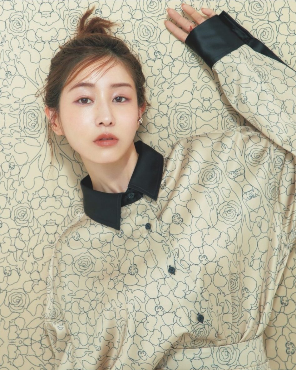 シャツ¥44,000、スカート¥36,300、背景のスカーフ¥20,900〈エンメ〈オペラスポーツ〉) イヤーカフ[右耳]¥129,800、イヤーカフ[左耳]¥50,600、リング[上]¥220,000(プライマル)リング[中]¥49,500、リング[下]¥75,900〈アバロン〈ヒロタカ〉)