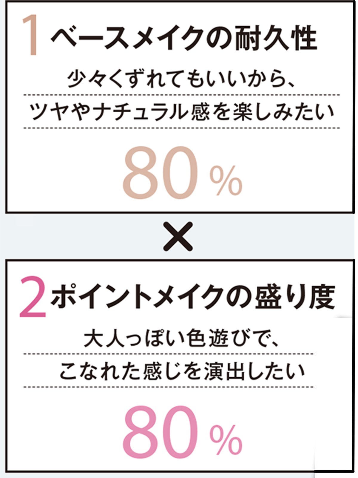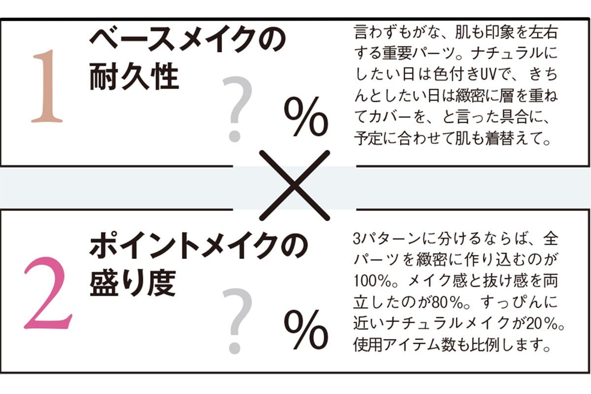 「その日会う人、行く場所、気候、体調…さまざまな要因が絡み合うことで、昨日しっくりきたメイクが今日は何だか似合わない、というのは往々にして起こること。つまり、予定次第で似合うと感じるメイクは変わる。この前提をぜひ胸に刻んで頂きたいのです。ではどのようにその日のベストバランスを見つけるのか。これまでの経験を元に考え抜いた結果、【予定に合うベースメイクの耐久性(%)×メイクの盛り度(%)】という、シンプルな方程式に行きつきました」