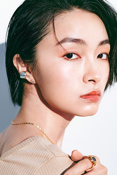 「私が提案する肌は、あたたかみのある、肌温度が1℃上がったような肌。マスクでなかなかチークができない今は、透明感はあるけれど、肌自体の血色を上げて、第一印象でも生き生き、ヘルシーに見えるように。アプリコット系の透ける下地でさりげなく体温を仕込み、リキッドの美膜と消えるパウダーでつるんとした潤い肌に仕上げます。全体に軽やかで薄膜のリラクシーなツヤ肌になる上、つけても心地よくストレスフリーでいられるのもポイントです!」( paku☆chanさん・以下「」内同)