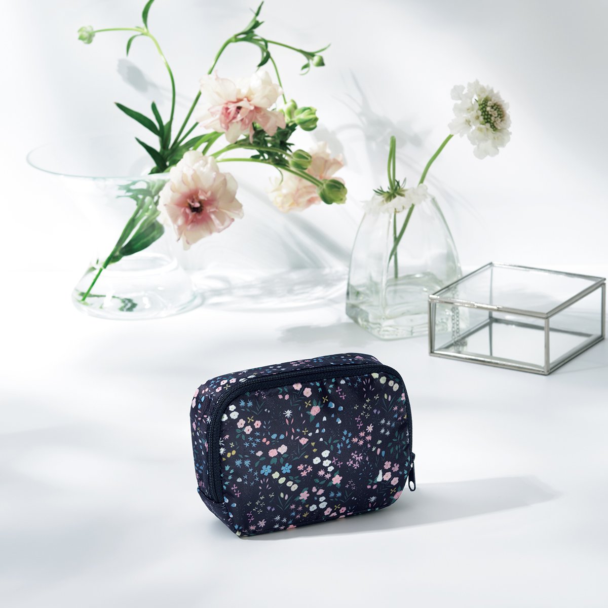コスメを入れるだけでなく、スマホの充電器やコード類、カメラのバッテリーなどを入れるのにもちょうどいいサイズ感。黒地の小花柄は男性がもってもおしゃれ!