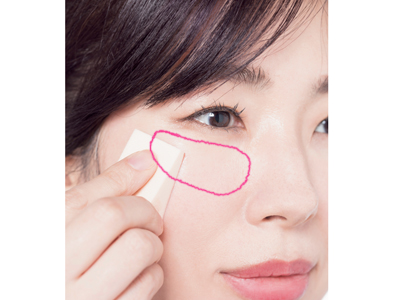 「このハイライトはスポンジで塗らないと良さが際立ちません。一見、濃いブロンズですがスポンジの面を使いポンポンとると、濃くなりすぎず適量を肌に塗れます。使うのはくすみが気になる目元だけなく、頰のよれやテカりが気になる部分にも。ナチュラルなツヤで粗をカムフラージュしながら、肌そのものがしっとり光沢しているように演出」