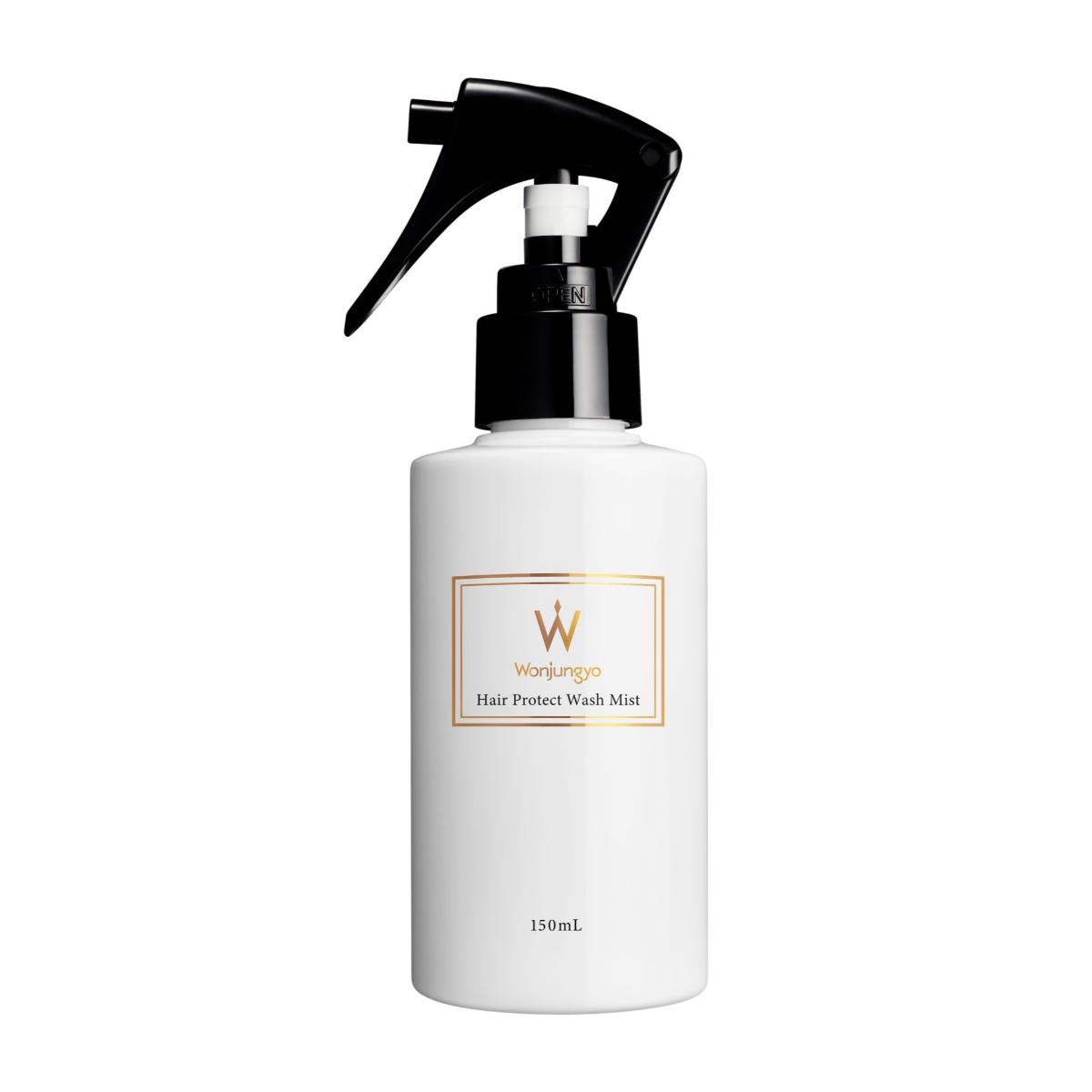 髪を濡らす前に、新商品の<ウォンジョンヨ ヘアプロテクトウォッシュミスト>を髪全体に塗布。コーミングをして髪全体に行き渡らせてから洗い流し、シャンプー、トリートメントを。