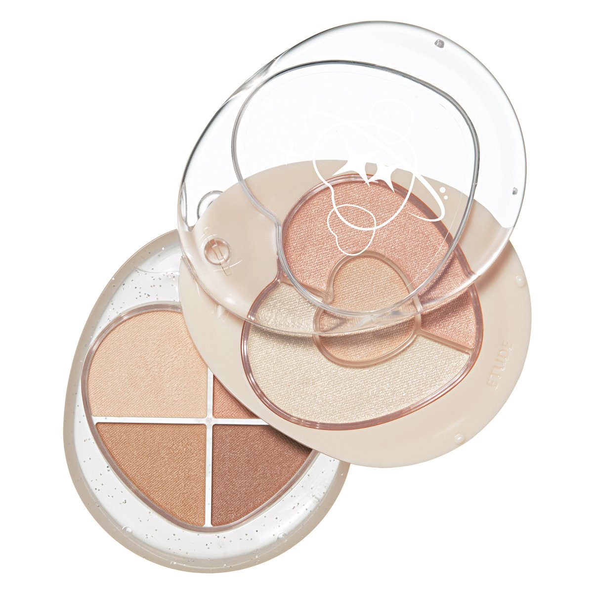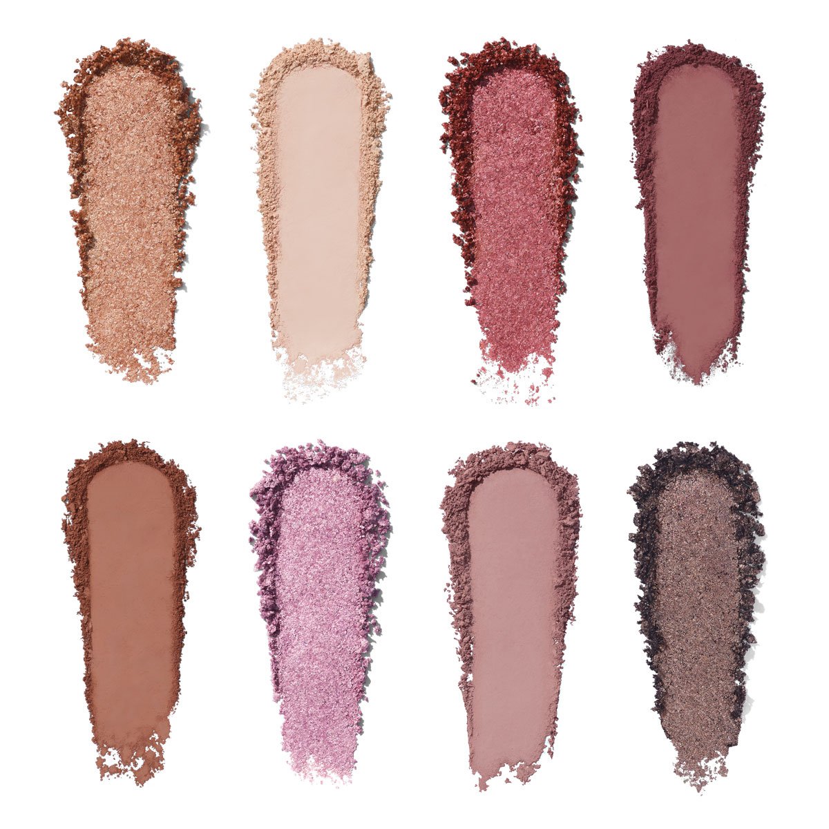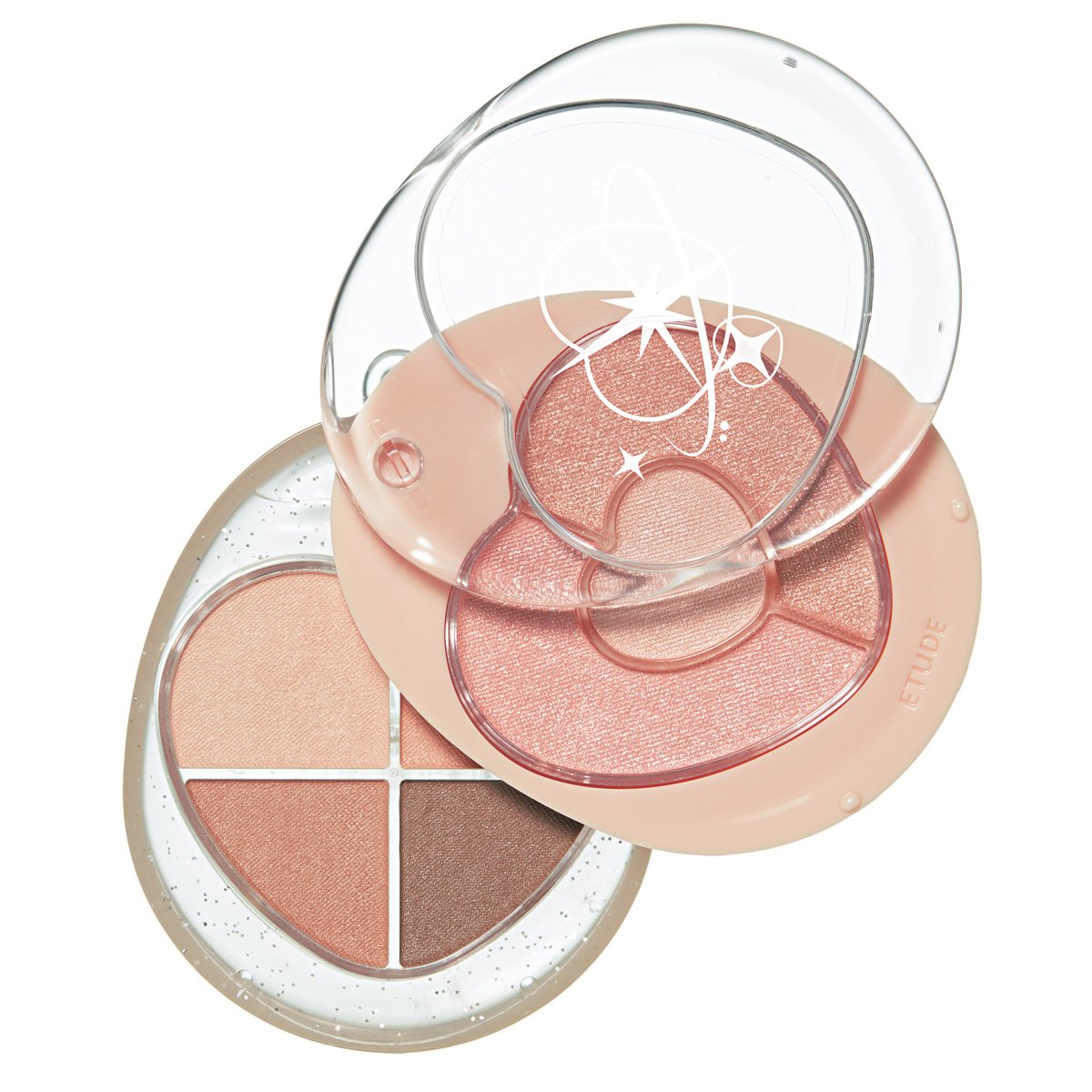 透け感のある発色と輝きで、奥行きのある目元を作るアイシャドウパレットの秋新色。高輝度ラメ・マット・シアーの異なる3つの質感が自然なグラデーションをかなえる。凜とした目元に仕上げるブラウン×オレンジ系の“キャラメルココア”&瞳の印象を引き立てるピンク系の“カシスフラッペ”。