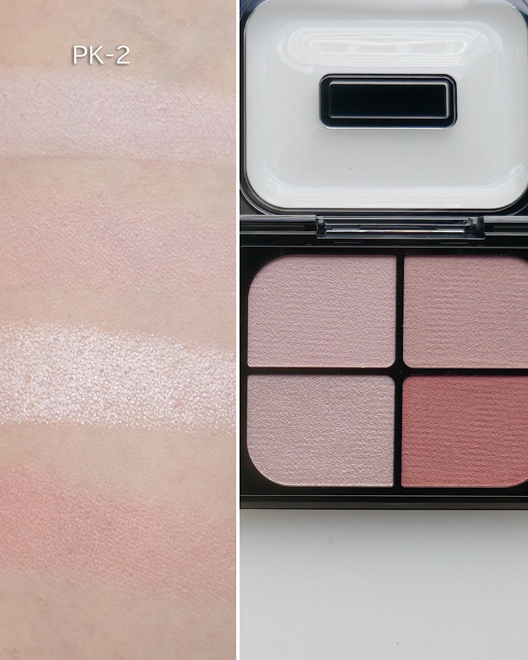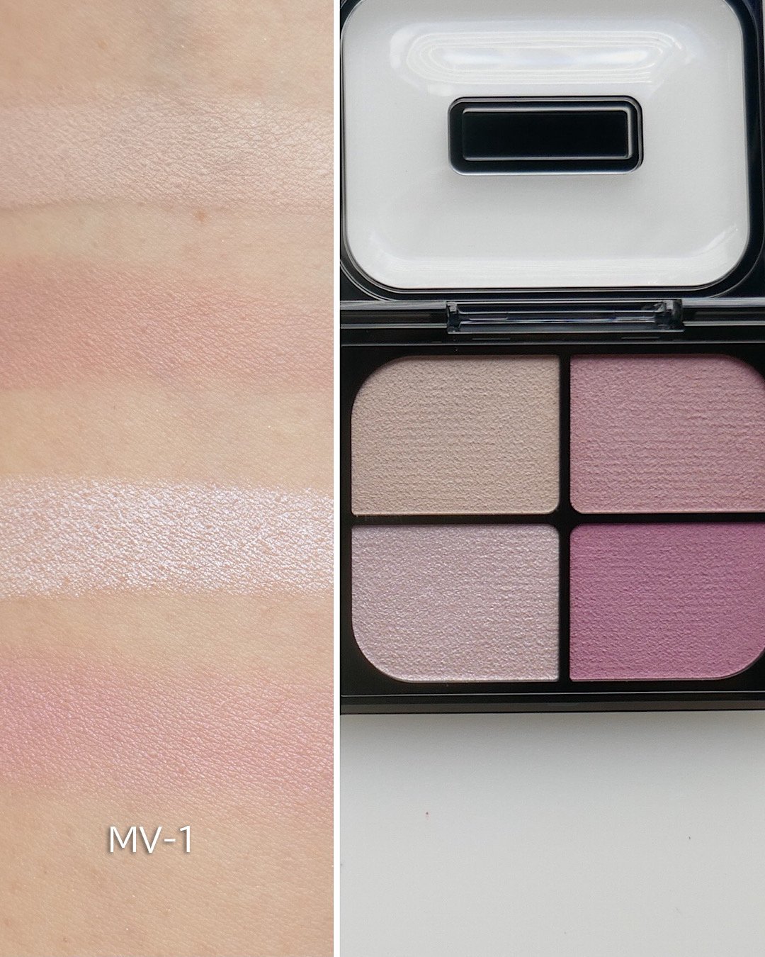 圧倒的な美肌に見せたいならこちら。青みの強いピンクモーヴと、青ラメの入ったハイライトの相乗効果で、清らかな透明感を演出。