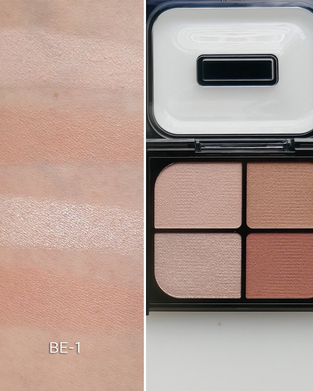 上2色は、肌色の0.1〜1トーンまで自在に調整する、陰影感を引き出すマットカラー。左下は、濡れたようなツヤを演出するハイライトカラー。右下は、にじみ出るような血色感カラー。肌になじむ発色で構成された4色パレットです。