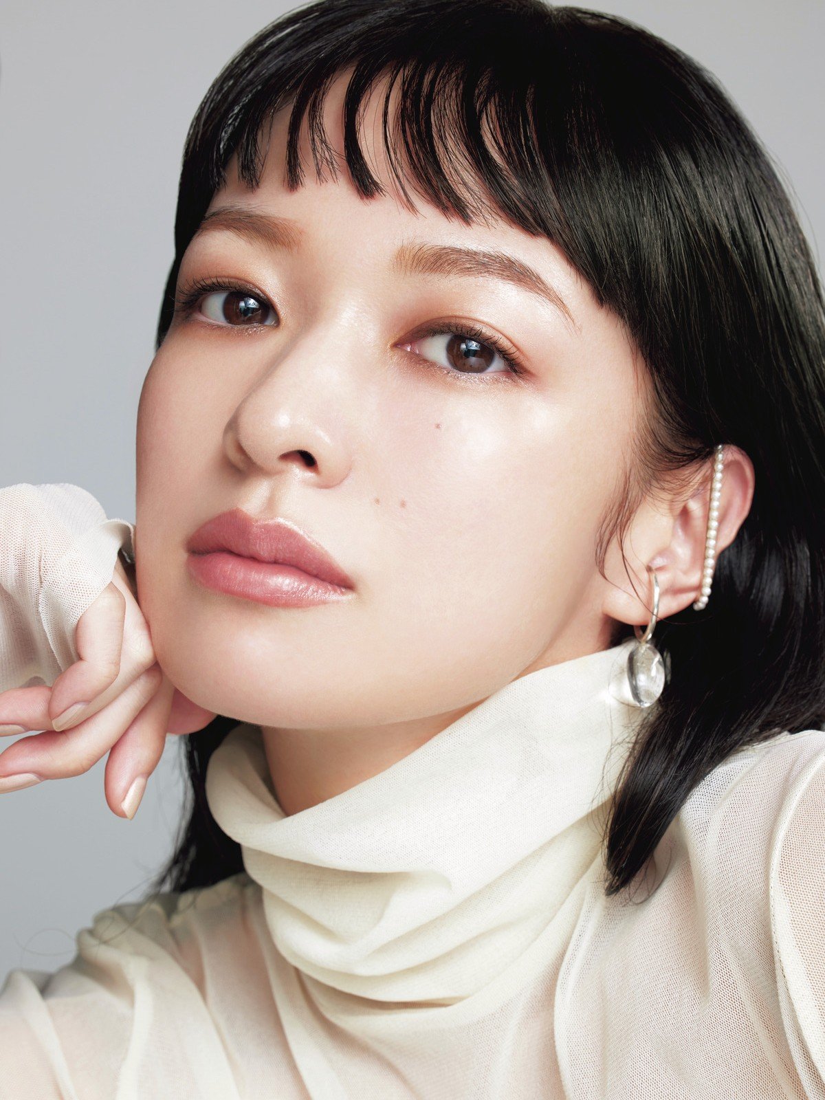 ベアトップつきシアーハイネックトップス¥39,600(エスケーシー〈メイメイジェイ〉) パールラインイヤカフ¥¥41,800(apsis) 水晶イヤカフ・両耳セットで¥16,500(AGU) インナー/スタイリスト私物