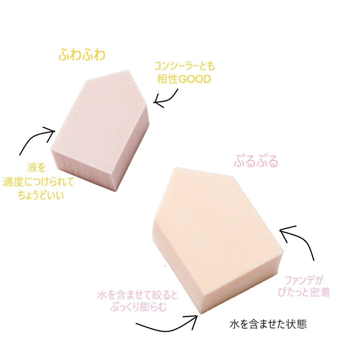 ふわふわで柔らかな質感のハウス型スポンジ。程よい吸水力で、液状ファンデやコンシーラーとも相性抜群。気になる部分に厚みをもたせてしっかりカバーも自在。