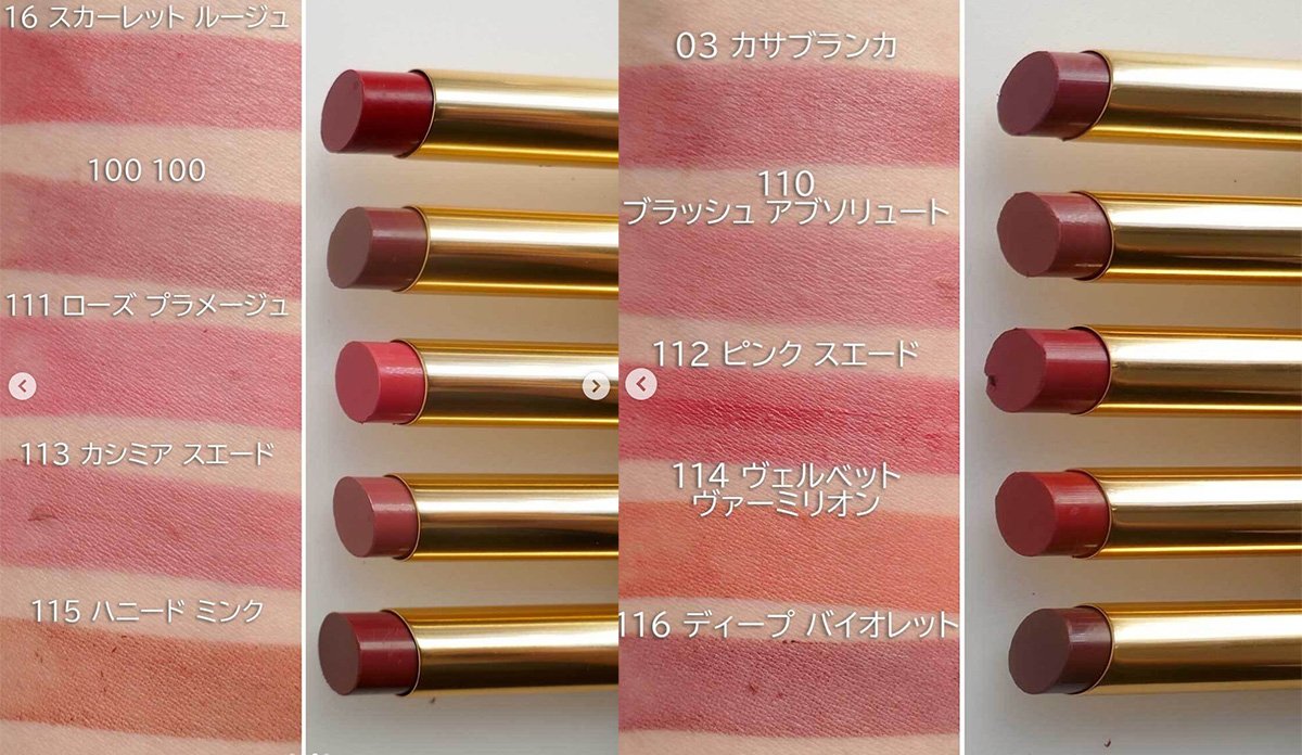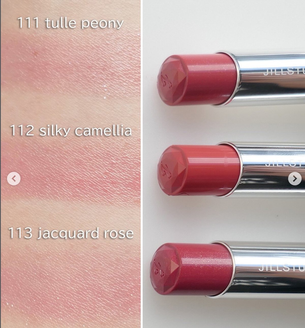 “111 tulle peony”は軽やかなコーラルピンク、“112 silky camellia”は華やかなチェリーレッド、“113 jacquard rose”は深みのあるダスティローズ。どんなメイクとも相性抜群の3色です。