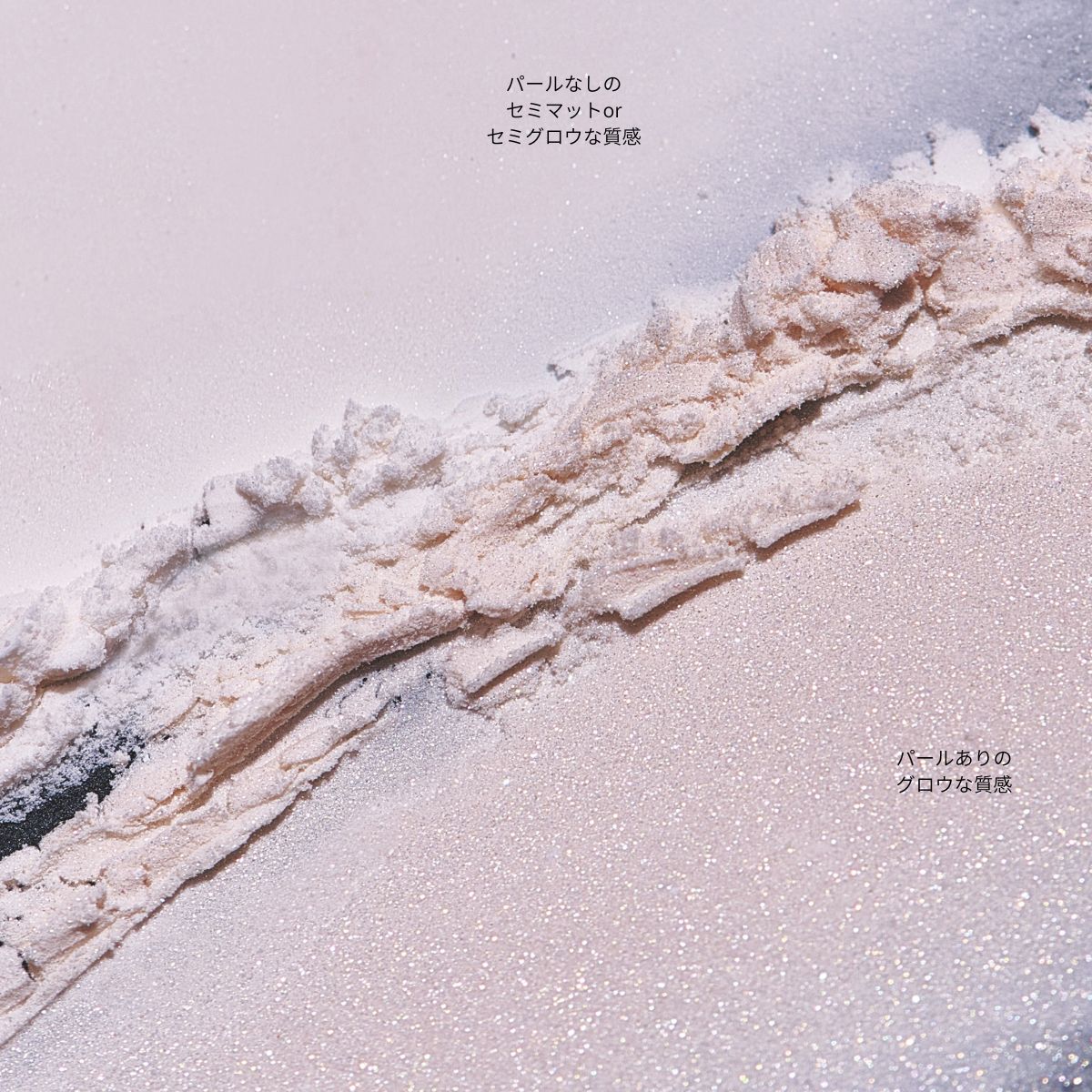 フェースパウダーの種類としてもうひとつあるのが、質感の違い。パール剤を多く配合しているものは、光の反射によって肌にキラッとしたツヤが出るので、潤った明るい印象に見えます。パールが入っていないものはセミマットorほんのりツヤのある質感に。