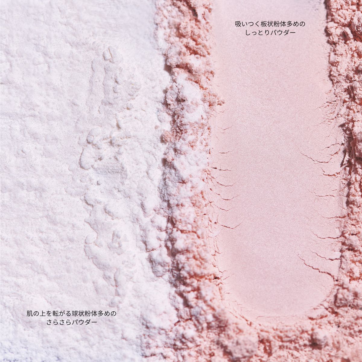 フェースパウダーは細かな“粉体”の集合体。粉体にはコロコロと転がる丸いものと、肌に密着しやすい板状のものなどがあり、何種かブレンドされています。このうち球状のものは表面にたくさん穴があいており、皮脂を吸着。球状パウダーが多いとさらさらした質感に、板状のパウダーが多いとしっとりした質感になります。