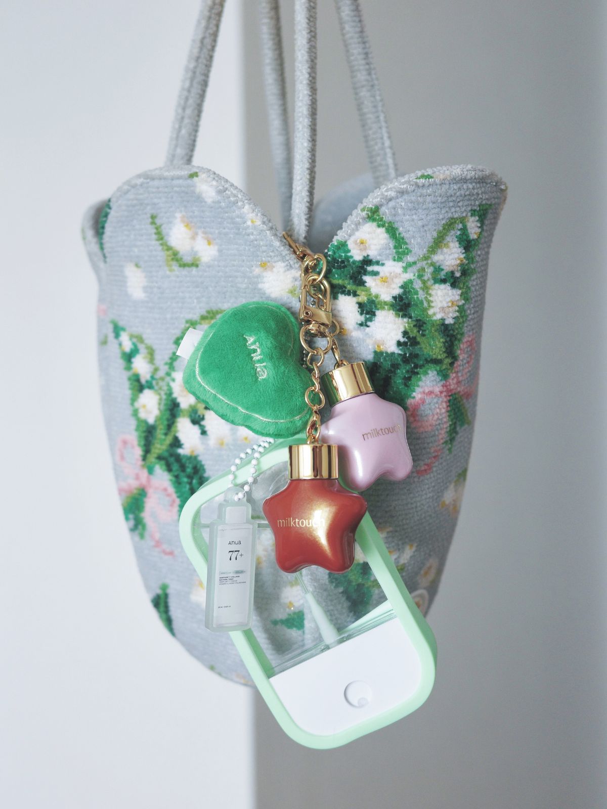 「韓国のイベントでゲットしたmilktouchのオーナメントリップとAnuaのドクダミトナーのミニスプレーをお直し用としてバッグにつけています。見た目もかわいくてテンションが上がります! 」(美的リーダーズ・みりんさん)