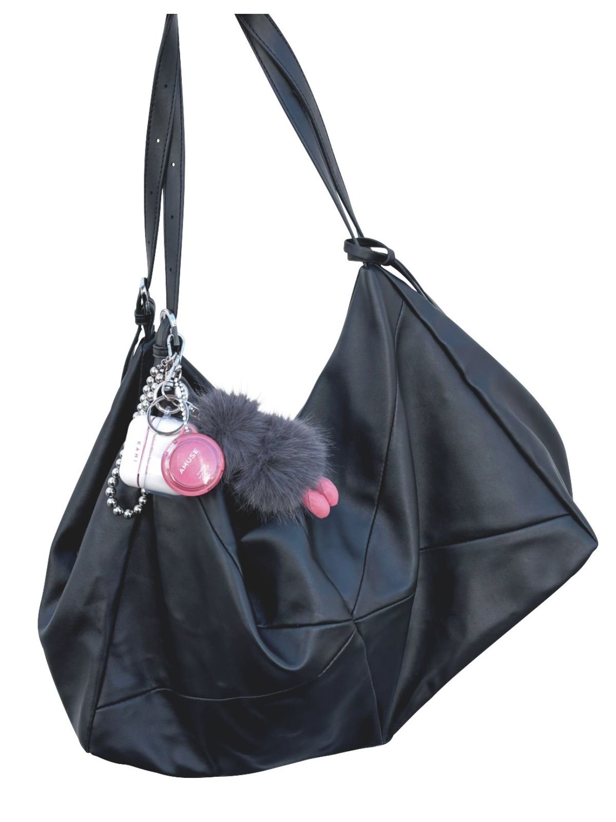 「ヘア&メイクの現場でもつバッグに、AMUSEのティントリップバームをつけています。現場では自分のメイク直しがなかなかできないので、ノールックでささっと塗って、色も潤いも足せるバームで重宝しています。キーホルダーも一緒に盛り盛りにデコるのが夢月流です!」(ヘア&メイク・夢月さん)