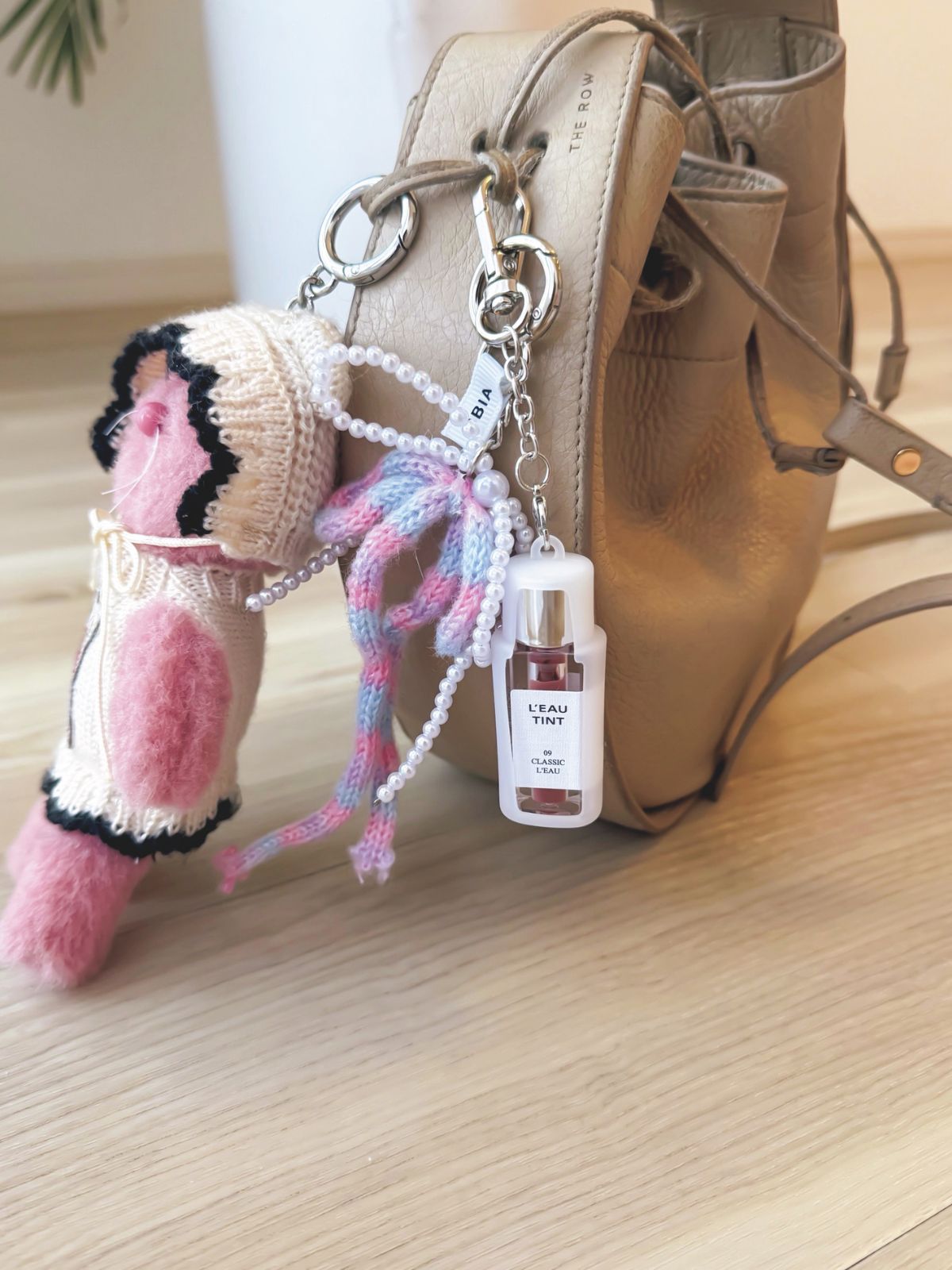 「BBIAローティントのミニリップについていたニットリボンチャームと、ニットマスコットをベージュのバッグにじゃらづけしてギャル感を楽しんでます。しゃれ色カラーを朝メイクしたリップの上から重ねて色変させるのが好きなので、もち運びしやすいミニサイズが◎」(ヘア&メイク・Kanakoさん)